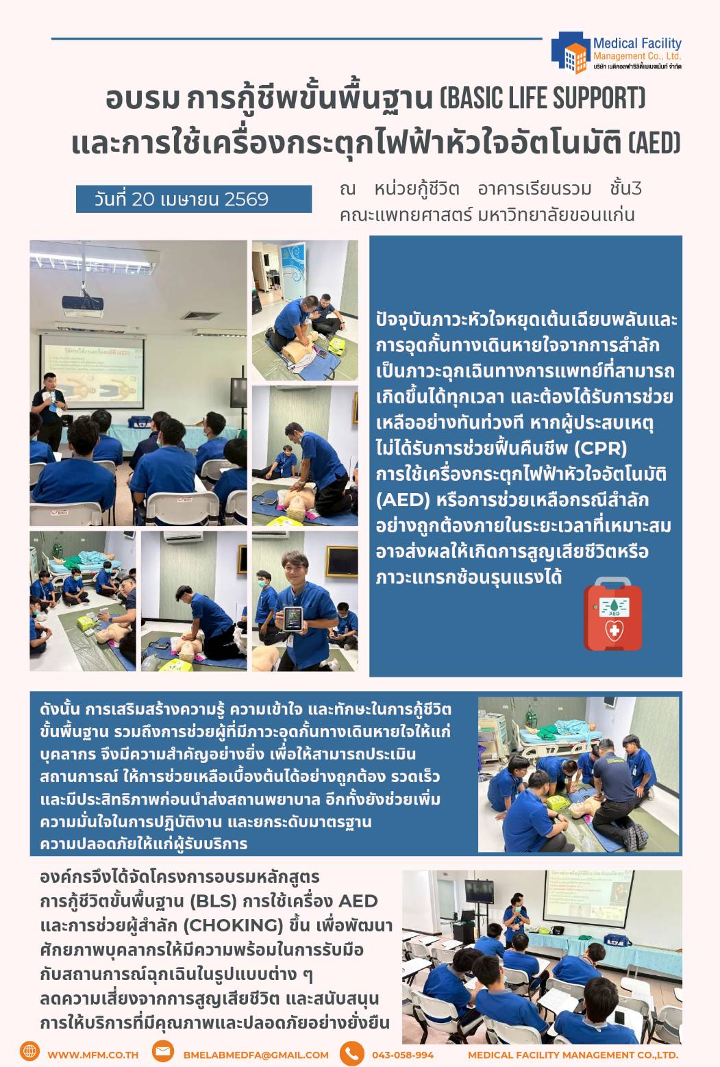 เมื่อวันที่ 20 เมษายน 2569 ที่ผ่านมา บริษัท เมดิคอล ฟาซิลิตี้ แมเนจเม้นท์ จำกัด (MFM) ได้จัดกิจกรรมอบรมหลักสูตร "การกู้ชีพขั้นพื้นฐาน (BLS)และการใช้เครื่องกระตุกไฟฟ้าหัวใจอัตโนมัติ(AED)" ให้กับบุคลากร ณ หน่วยกู้ชีวิต อาคารเรียนรวม ชั้น3 คณะแพทยศาสตร์ มหาวิทยาลัยขอนแก่น